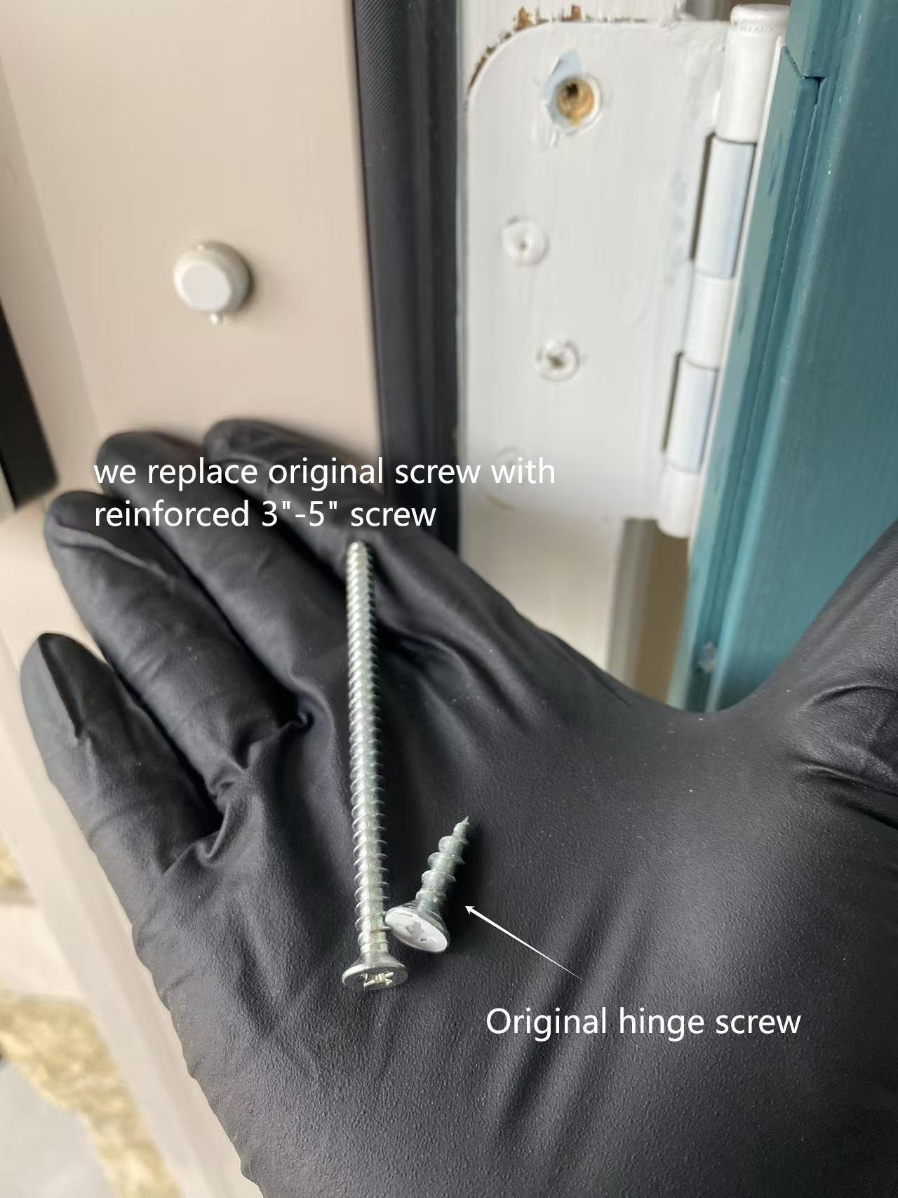 We replace original builder scres (3/4 inch to 1/2 inch) with 3 to 5" hardened steel screws.
